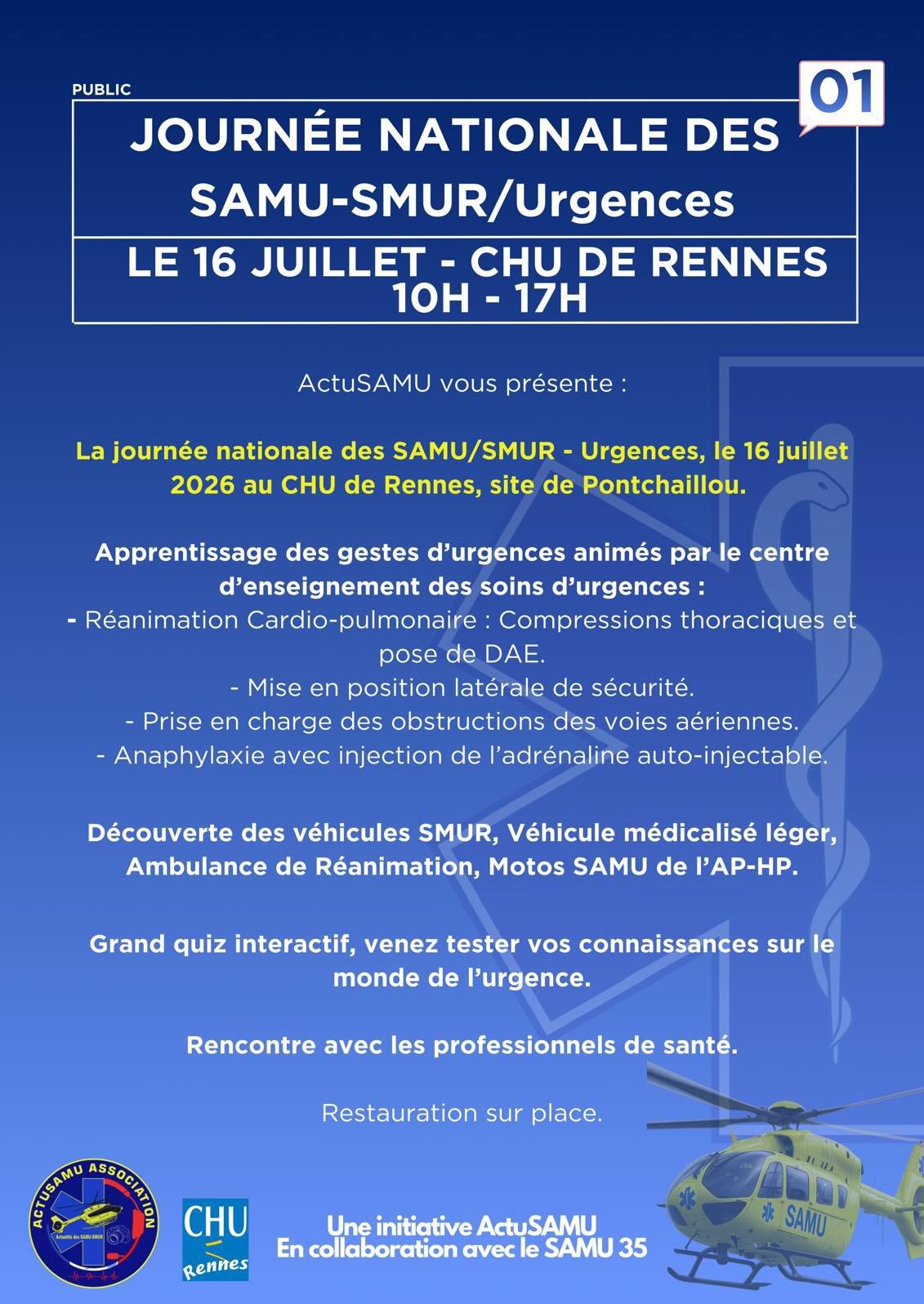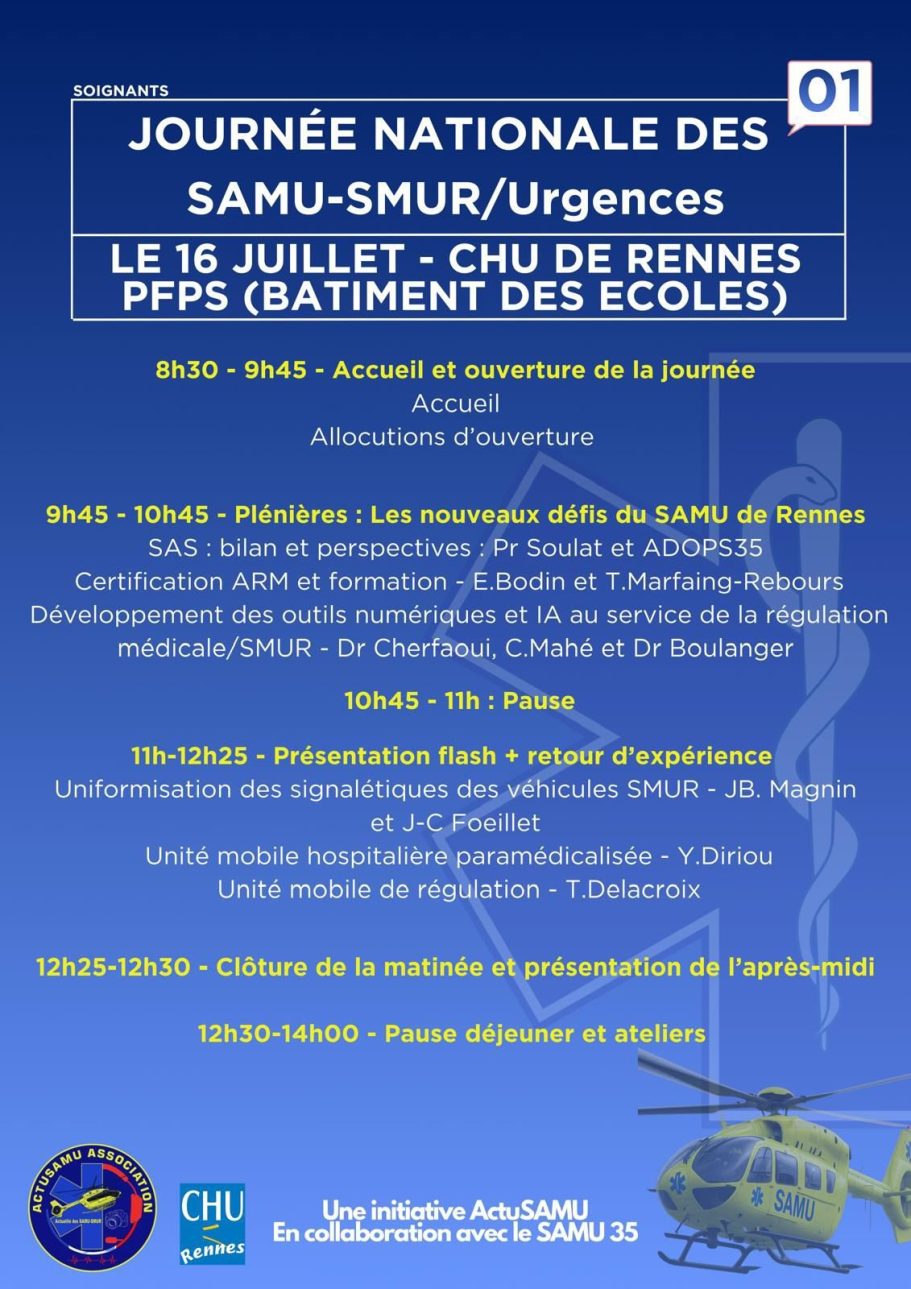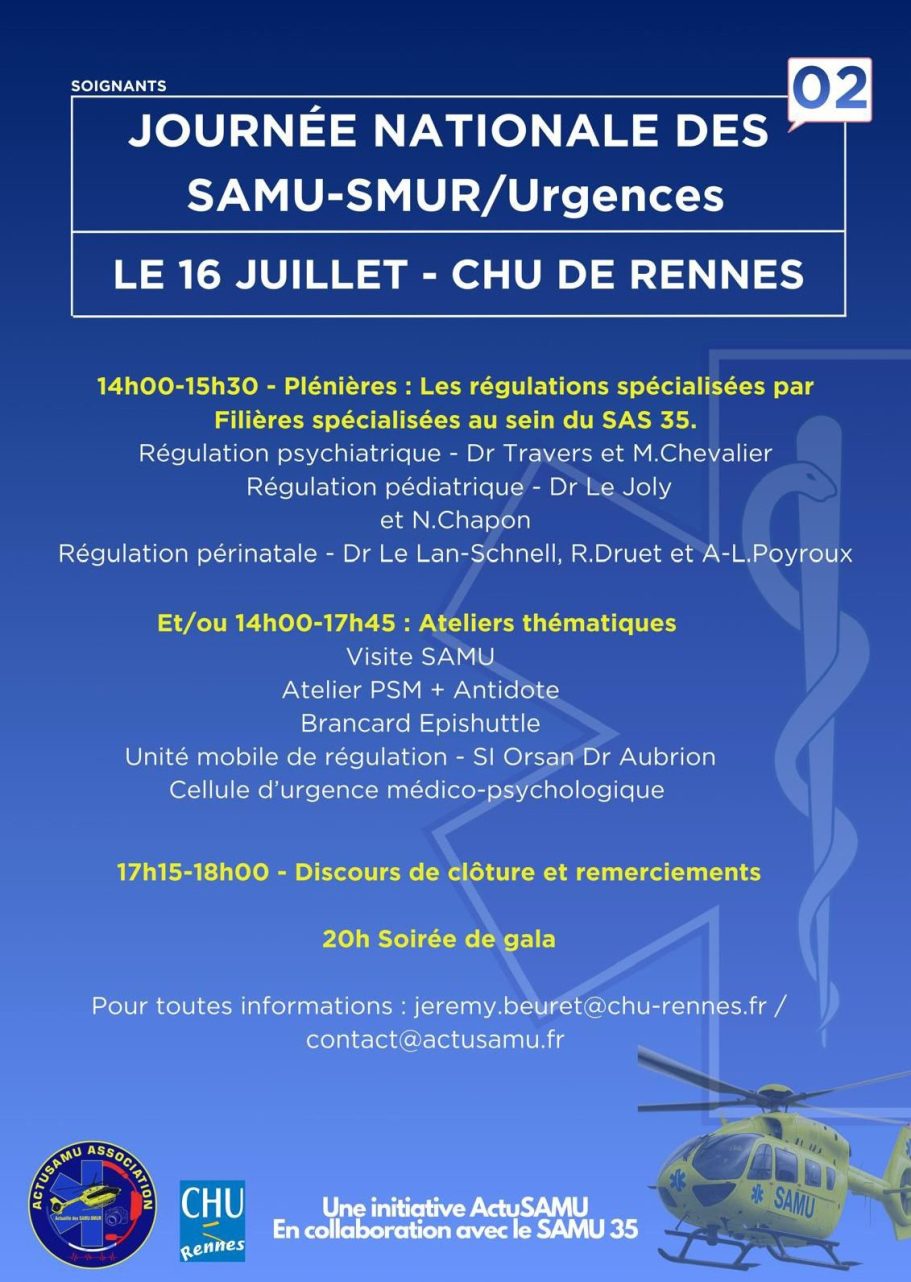 L’association ActuSAMU organise en 2026 pour la troisième édition, la Journée Nationale des SAMU/SMUR, en parfaite collaboration avec les équipes du SAMU35 et du Centre Hospitalier de Rennes.